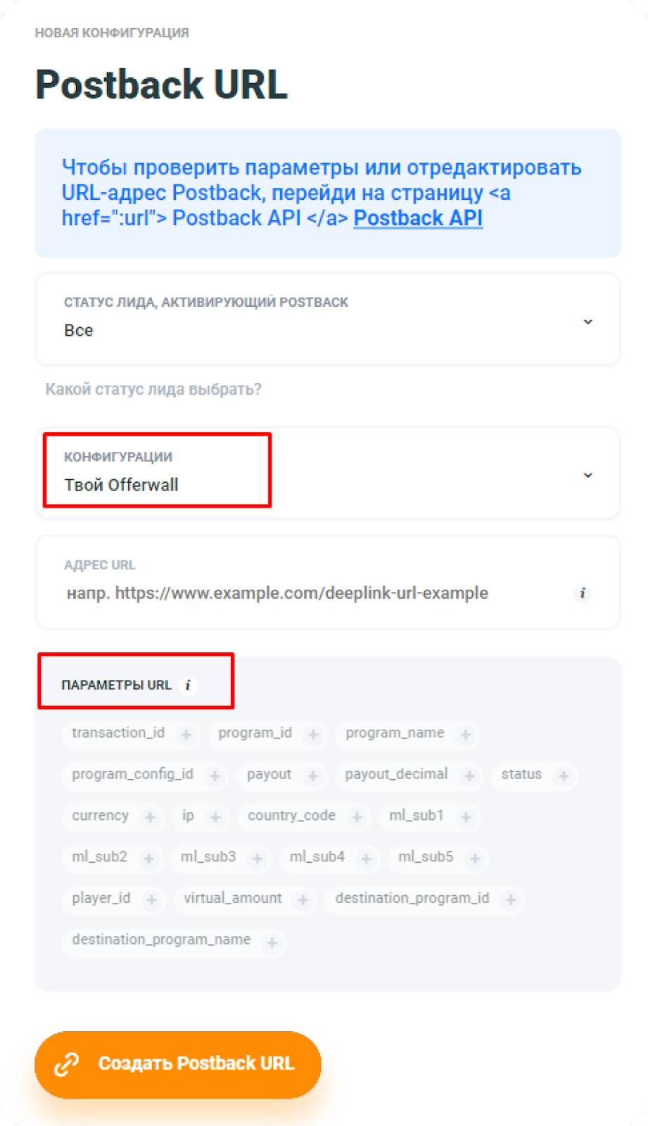 В завершение нажми на кнопку “Создать Postback URL”. Более подробную информацию о настройке Postback можно найти на его подстранице или в статье у нас на сайте.