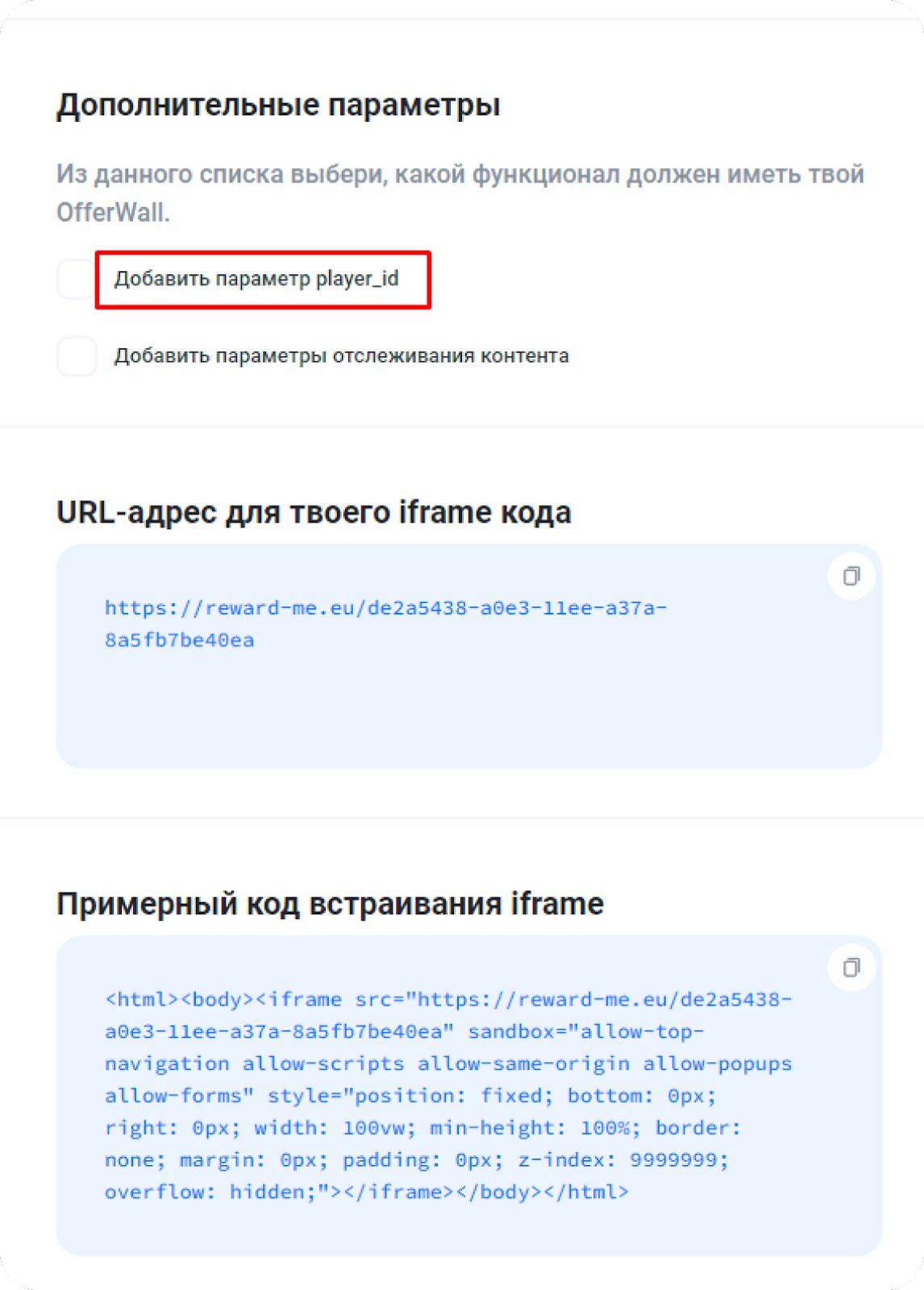 Далее обрати внимание на параметр Player ID, который является уникальным идентификатором пользователя в твоем Offerwall. Присвоение идентификатора пользователя является очень важным моментом, поэтому стоить добавить параметр 'player_id' в ссылку Offerwall. Мы рекомендуем использовать UUID (Universally Unique Identifier версии 1) или целочисленный формат. Ты можешь использовать генератор UUID, доступный по адресу https://www.uuidgenerator.net/. Если же параметр 'player_id' не был добавлен, то он будет автоматически сгенерирован и сохранен в браузере во время первого посещения Offerwall пользователем.