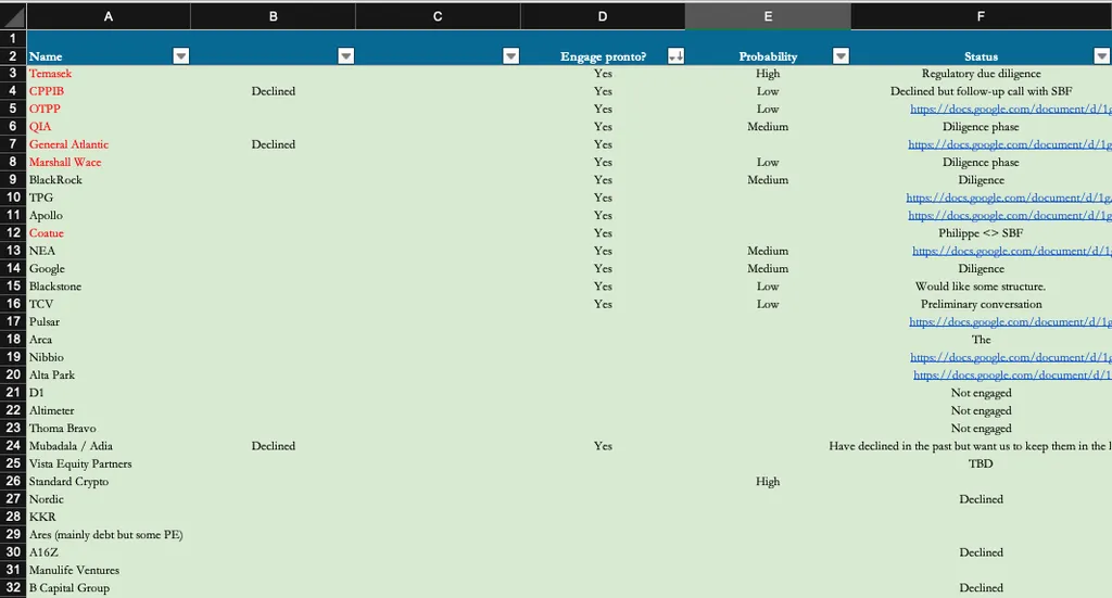 В таблице указано, что вероятность того, что BlackRock и Google примут участие в раунде финансирования, была «средней». В нем также говорится, что обе фирмы проводили комплексную проверку биржи Бэнкмана-Фрида до ее краха 11 ноября.