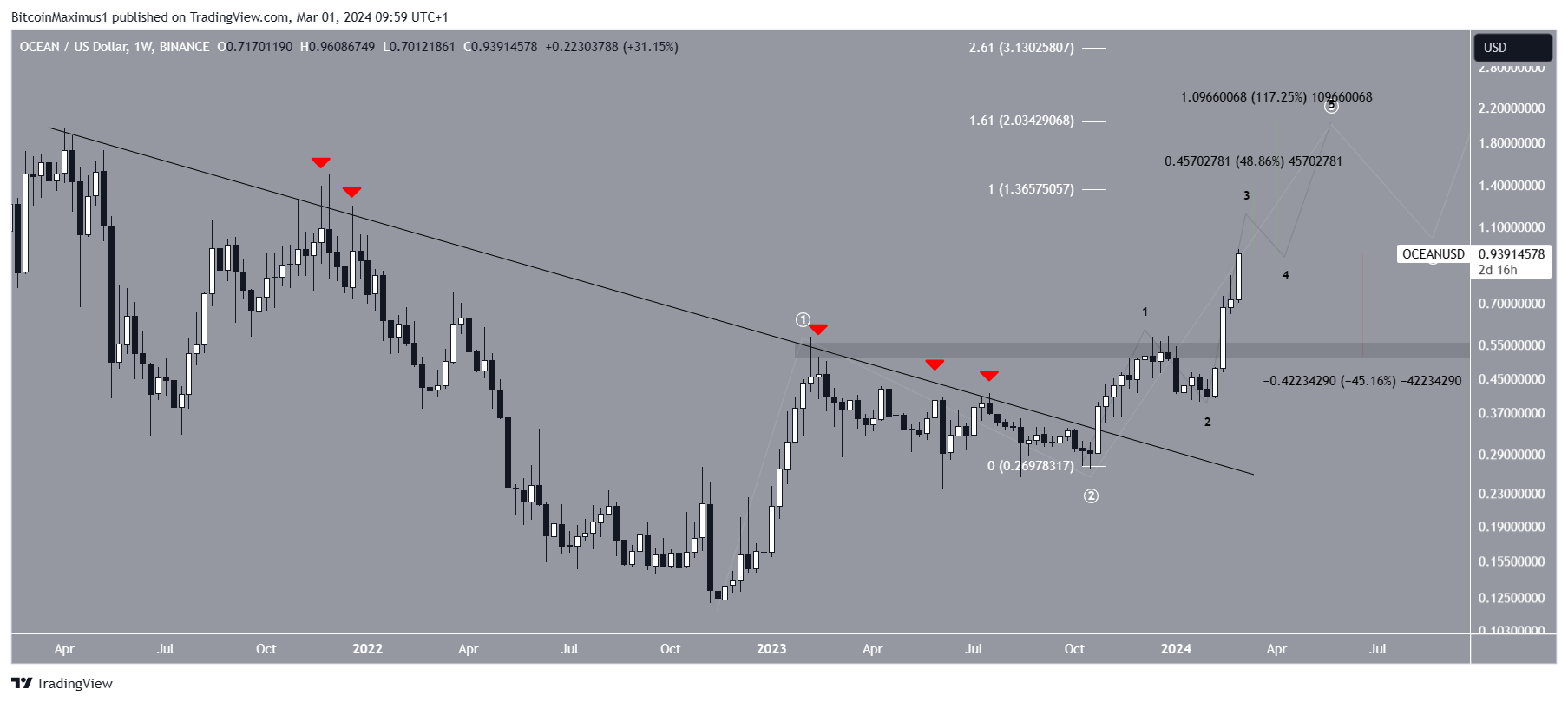 На этой неделе OCEAN достиг нового годового максимума в $0,88, при этом волновой анализ поддерживает восходящее движение и прорыв. Согласно наиболее вероятному расчету, токен находится в третьей волне пятиволнового восходящего движения. Если это так, его цена может вырасти до следующих сопротивлений на уровне $1,36 или $2,03. В первом случае соотношение первой и третьей волн составит 1:1, а во втором — 1:1,61. Это будет означать движение вверх на 50 % и 120% соответственно.