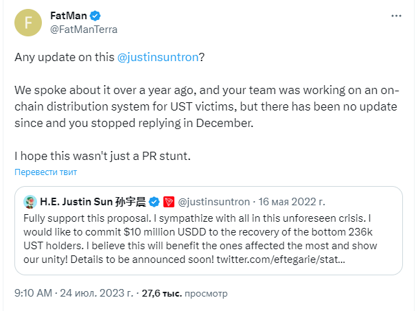 Известный член сообщества Terra FatMan заявил о готовности решить проблемы, связанные с задержкой выполнения обещания основателем Tron Джастином Саном выделить $ 10 млн на помощь пострадавшим от кризиса UST.