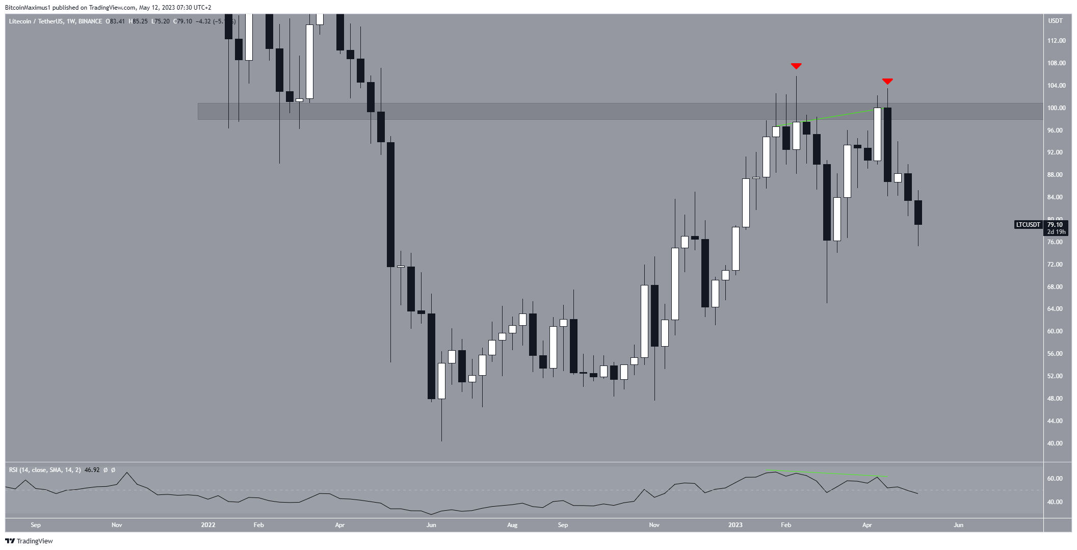 Однако цене не удалось преодолеть долгосрочное горизонтальное сопротивление на $100. Она дважды отскакивала от этого уровня (красные значки). В результате этих отскоков на графике сформировалась двойная вершина. Это медвежий паттерн, который может обусловить существенное снижение LTC.
