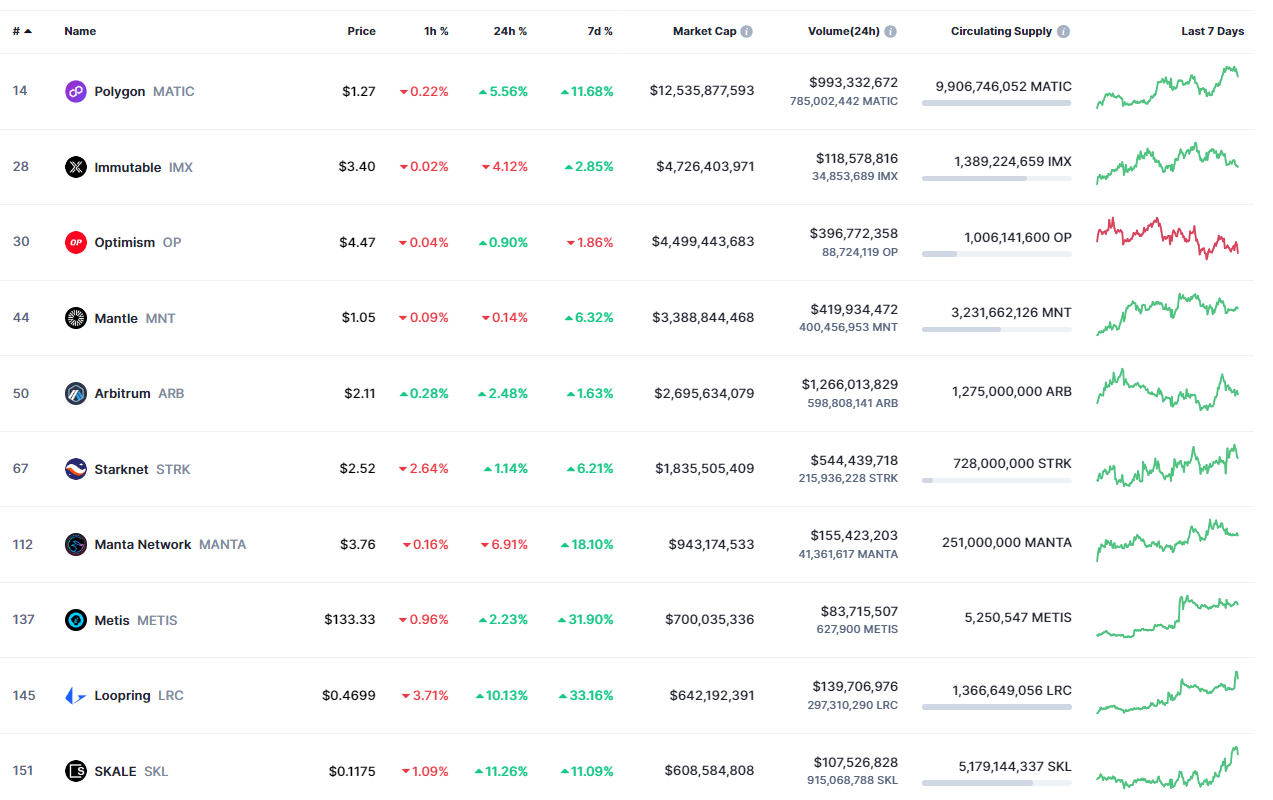 Топ-10 самых капитализированных токенов решений второго уровня. Источник: CoinMarketCap