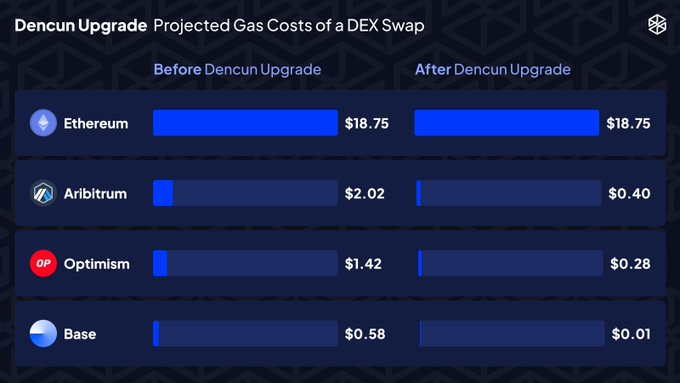 Как изменились комиссии в сети ETH и решениях второго уровня для ETH на фоне Dencun. Источник: X