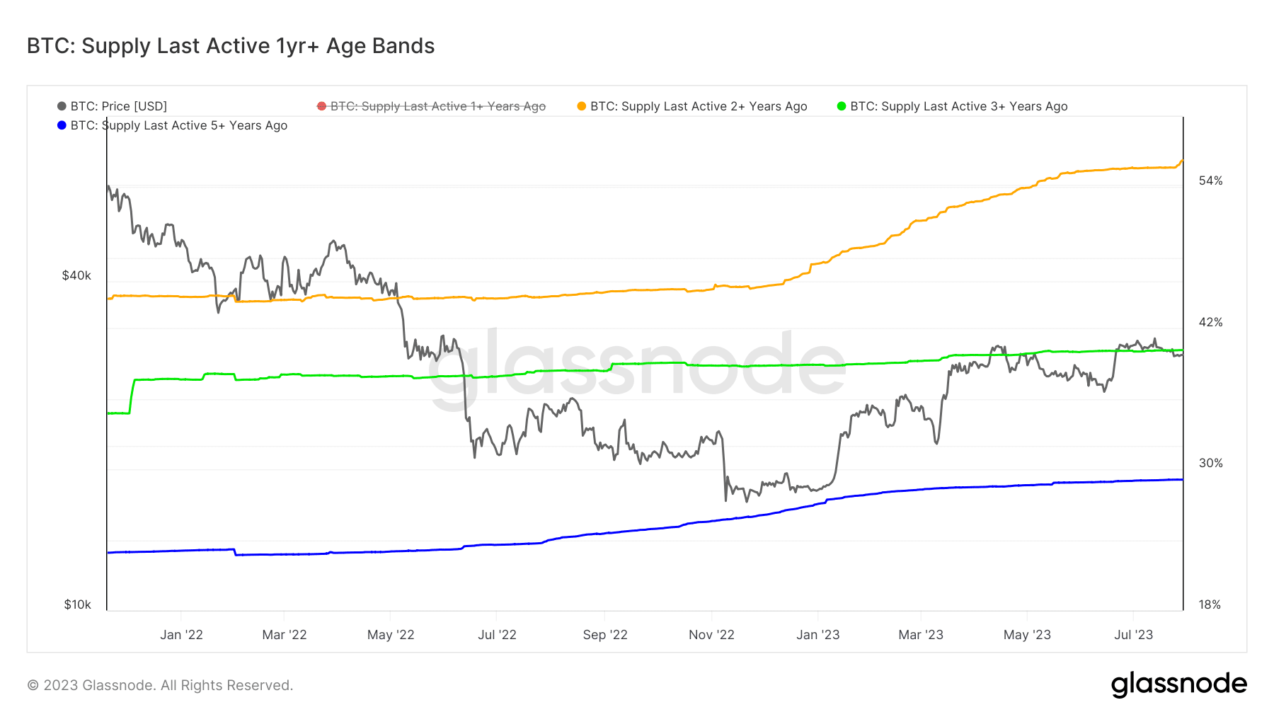 Интересно, что продажи касались монет с длительностью хранения от 1 года до 2 лет, в то время как более «старые» BTC продолжали пылиться в кошельках инвесторов. Так, предложение BTC, удерживаемое более 2 лет, увеличилось с 47% в начале 2023 года до текущих 56%.