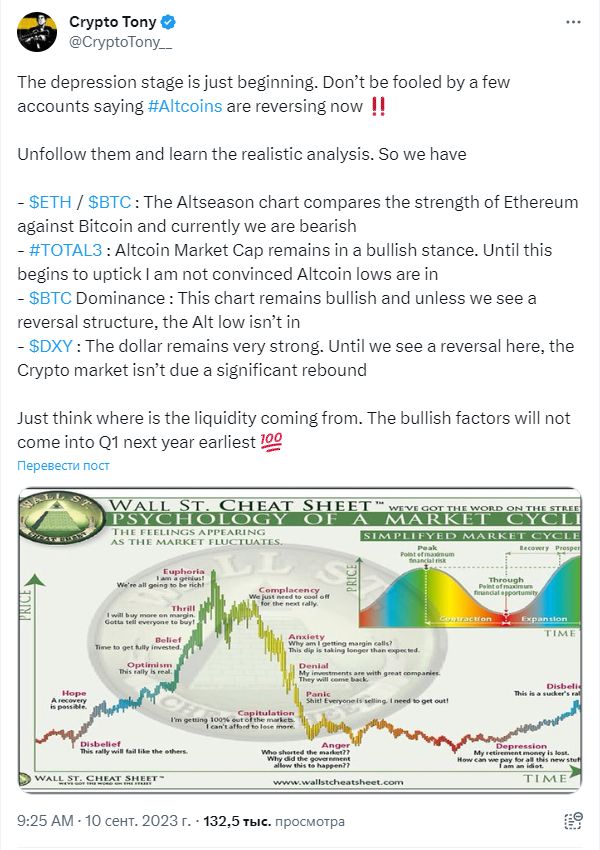 По словам ведущего криптоаналитика Крипто Тони (Crypto Tony), мы находимся в начале стадии депрессии альткоинов.