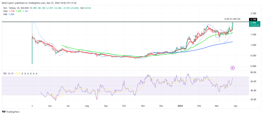 Нативный токен блокчейна Sui наиболее близок к тому, чтобы обновить исторический максимум. За последние 48 часов цена актива выросла на 21%, вплотную приблизившись к прошлому пику в $2,10.