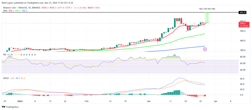 Хотя MACD и RSI сейчас отмечают снижение, они не указывают на медвежьи тенденции. Пока BNB остается выше 50-дневной экспоненциальной скользящей средней (EMA), у монеты будет шанс на восстановление, которое, скорее всего, произойдет в апреле.