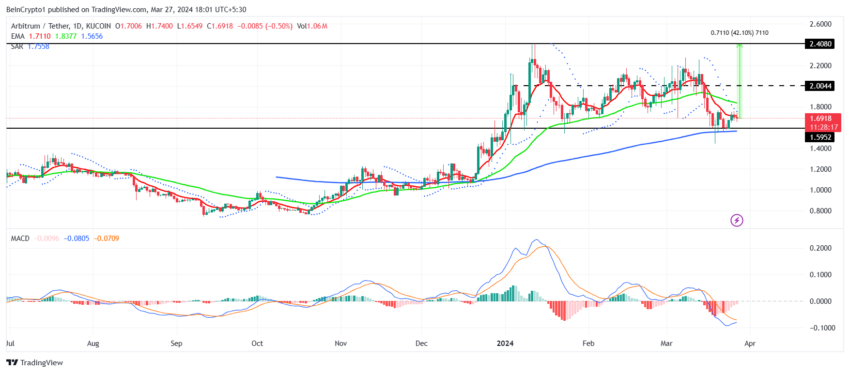 Чтобы добраться до отметки $2, ARB нужно закрепиться выше 50- и 100-дневных EMA. Этот уровень поддержки обеспечит необходимый толчок для дальнейшего роста к $2,40. Индикатор MACD, тем временем, указывает на приближение бычьего пересечения, что говорит о скором возобновлении восходящего тренда.