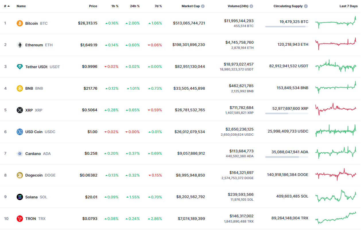 Биткоин сегодня продемонстрировал рост, и торгуясь выше уровня сопротивления в 26 000 долларов США, возглавил суточное ралли среди большинства ТОП-10 криптовалют.