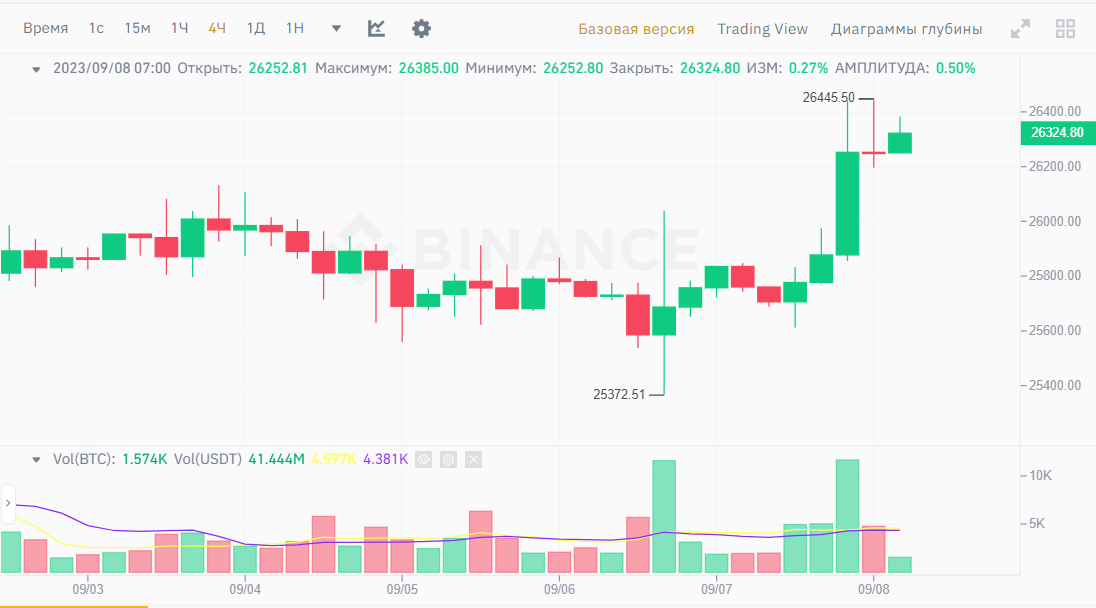 Напомним, что с прошлой субботы ведущая мировая криптовалюта торговалась между 25 500 и 26 000 долларов США. Сегодня он достиг восьмидневного максимума в 26 445,30 долларов США.