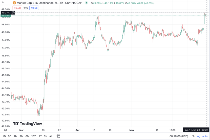 Доминирование биткоина неуклонно растет с ноября 2022 года, заметно ускорившись во время мартовского банковского кризиса. После субботнего всплеска показатель находится на самом высоком уровне с 2021 года.