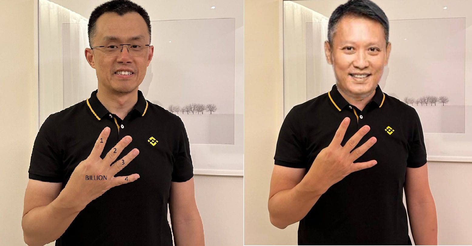 Надпись «4 миллиарда» на пальцах Чжао — отсылка к сумме штрафа, которую Binance придется заплатить американским регуляторам. Участники рынка иронизируют, что Чжао со своей «четверкой» предсказал штраф задолго до того, как его озвучили регуляторы.