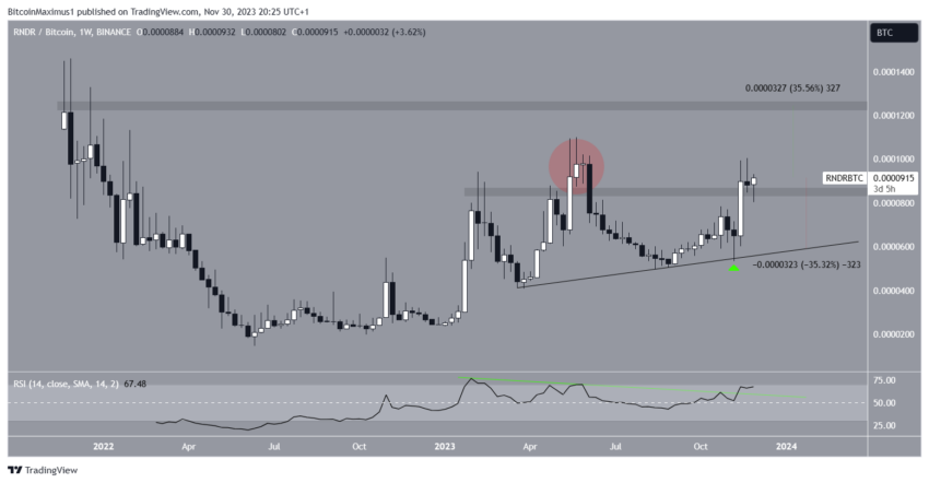 Цена RNDR растет с июня 2022 года. В мае этого года она поднялась выше важной области сопротивления 9000 сатоши, обновив годовой максимум на отметке 11000 сатоши. Однако вскоре после этого курс альткоина снова просел ниже нее, подтвердив, что прорыв был лишь отклонением.