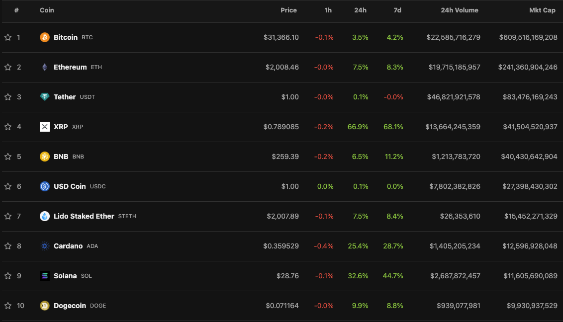 Активы из топ-10 по капитализации перешли в «зеленую зону». Самый значительный рост за последние сутки демонстрируют XRP (66,9%), Cardano (25,4%) и Solana (32,6%).