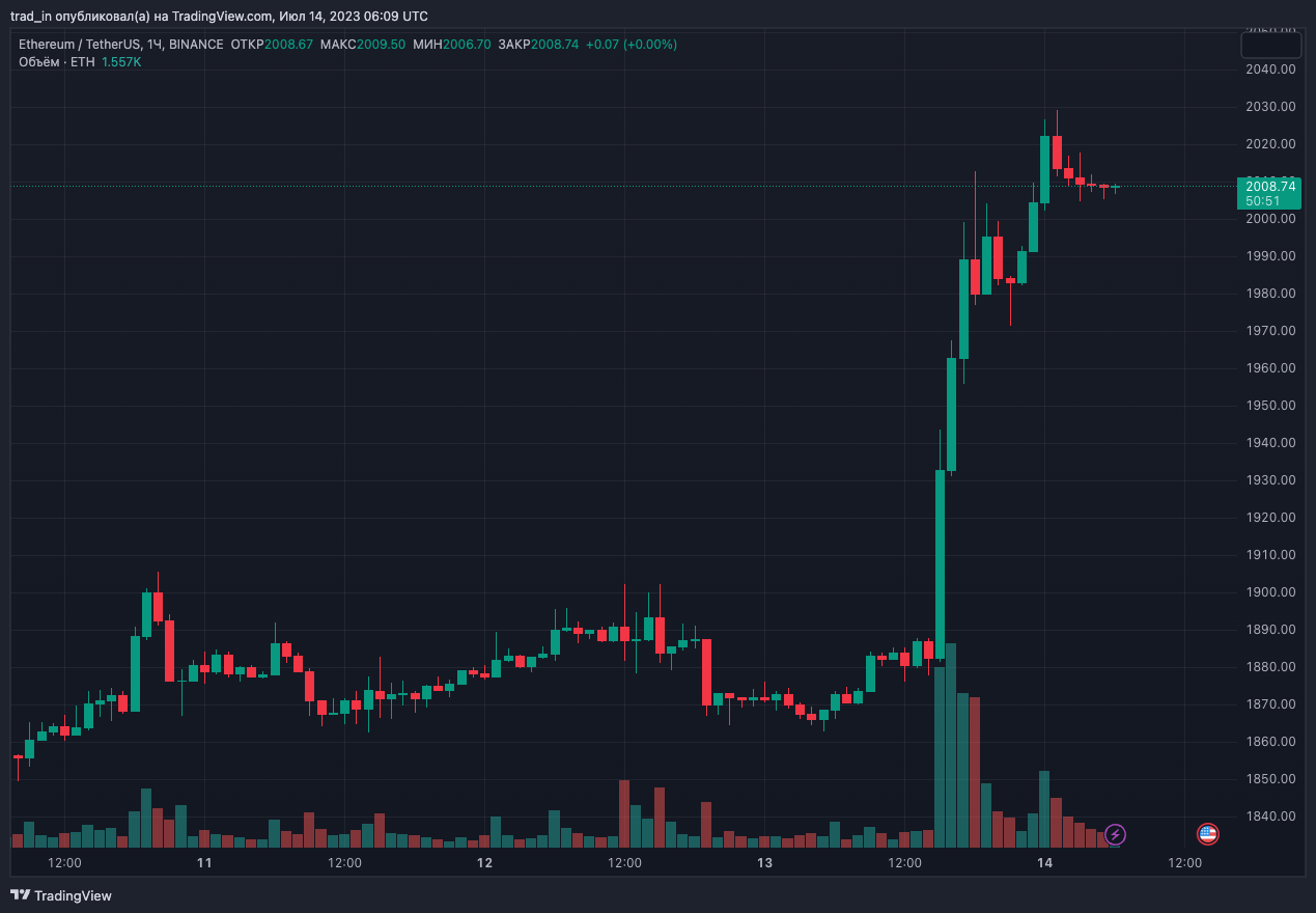 В ночь на 14 июля котировки второй по капитализации криптовалюты превысили уровень $2000 впервые с мая.