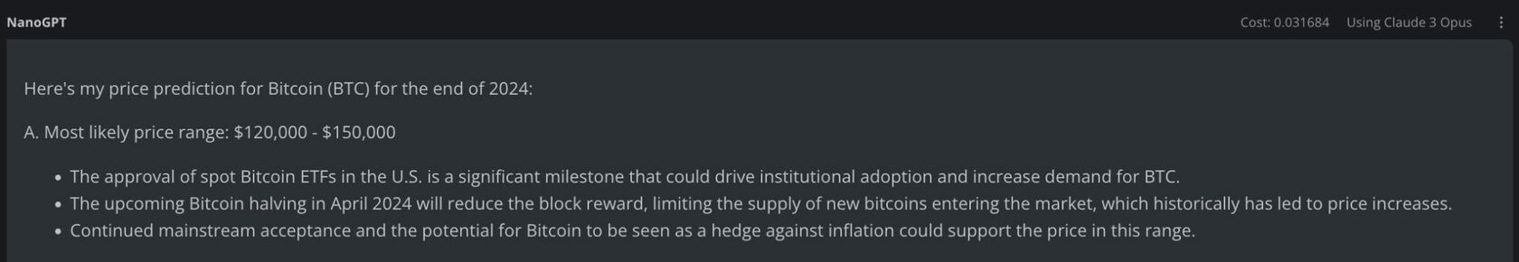В этом контексте Финболд получил доступ к Claude 3 Opus и побудил премиальный искусственный интеллект спрогнозировать цену биткоина к концу года. Для справки мы спросили Клода о наиболее вероятном диапазоне, максимальном и минимальном обменных курсах, по которым BTC будет торговаться в 2024 году.