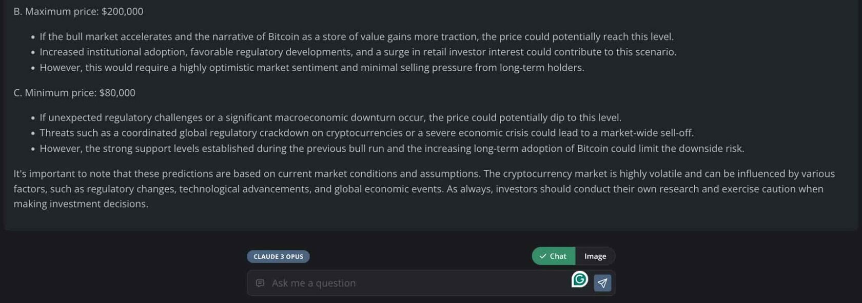 Примечательно, что Claude 3 Opus прогнозировал максимально возможную цену в 200 000 долларов за BTC при минимальной цене в 80 000 долларов. Однако искусственный интеллект предупреждает, что Биткоину нужны “очень оптимистичные рыночные настроения” и “минимальное давление со стороны продавцов”, чтобы достичь бычьего прогноза в 200 000 долларов.