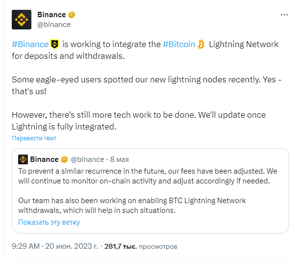 Некоторые пользователи уже заметили наши новые ноды Lightning, — говорится в сообщении Binance. — Да, это мы! Впереди ещё много технической работы. Мы расскажем, когда Lightning будет полностью интегрирована.