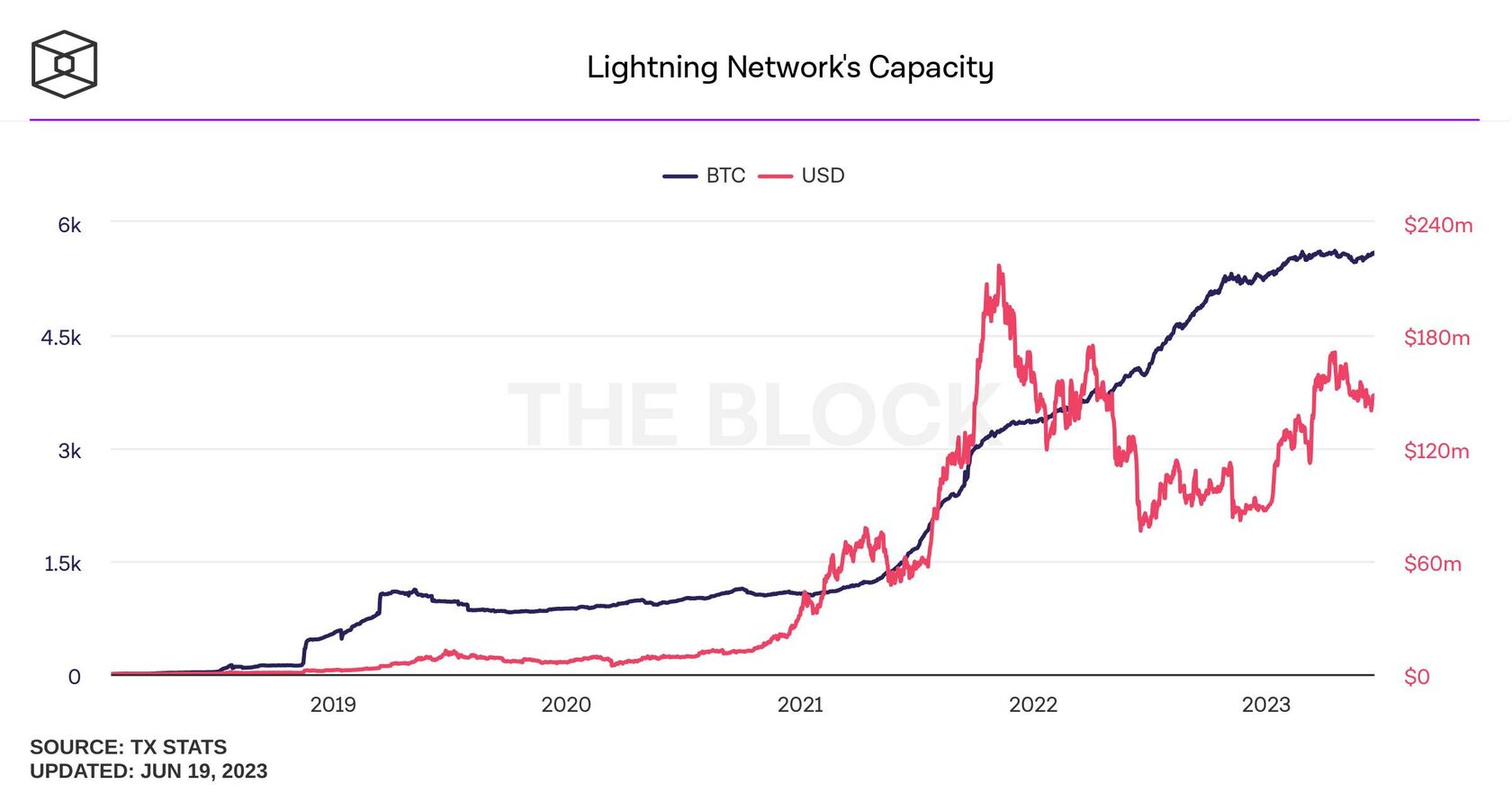 Сеть Lightning Network на базе биткоина может поддерживать 1 миллион транзакций в секунду. Согласно информационной панели The Block, за последний год пропускная способность сети неуклонно росла.