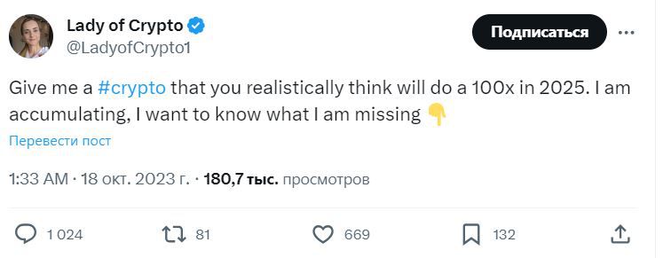 «Назовите криптовалюту, которая, по вашему мнению, может дать 100 иксов в 2025 году. Я накапливаю [монеты]. Хочу знать, что я могу пропустить», — написала Lady of Crypto в своем микроблоге.