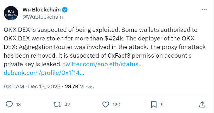 Децентрализованную биржу (DEX) OKX взломали. Информация о подозрительной активности кошельков, связанных с торговой платформой, появилась в микроблогах участников криптосообщества