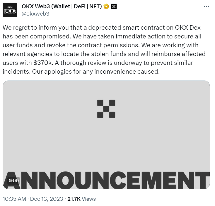 Представители OKX прокомментировали кражу денег. По их словам, речь идет о краже активов на $370 тыс. с 18 кошельков. Предположительно, мошенники использовали заброшенный рыночный контракт маркет-мейкера, чтобы получить доступ к активам. Команда торговой платформы пообещала возместить пользователям все украденные деньги. Также представители OKX инициировали проверку безопасности, чтобы исключить вероятность повторения инцидента.