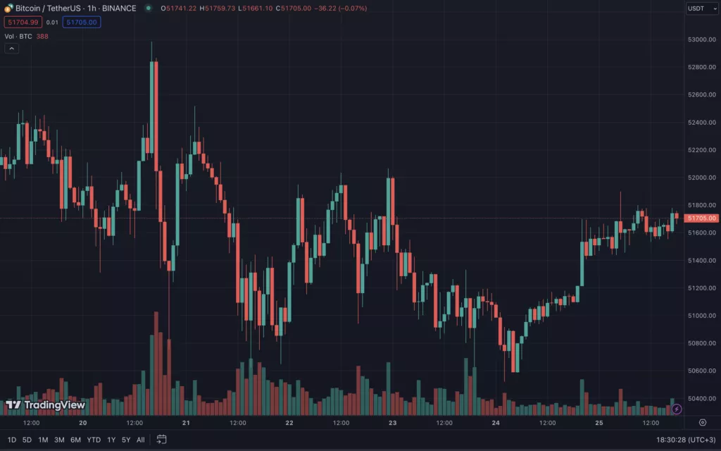 На этой неделе первая криптовалюта торговалась в диапазоне между $51 000 и $53 000. В субботу, 24 февраля, цифровое золото провалило уровень $51 000, но быстро восстановилось.