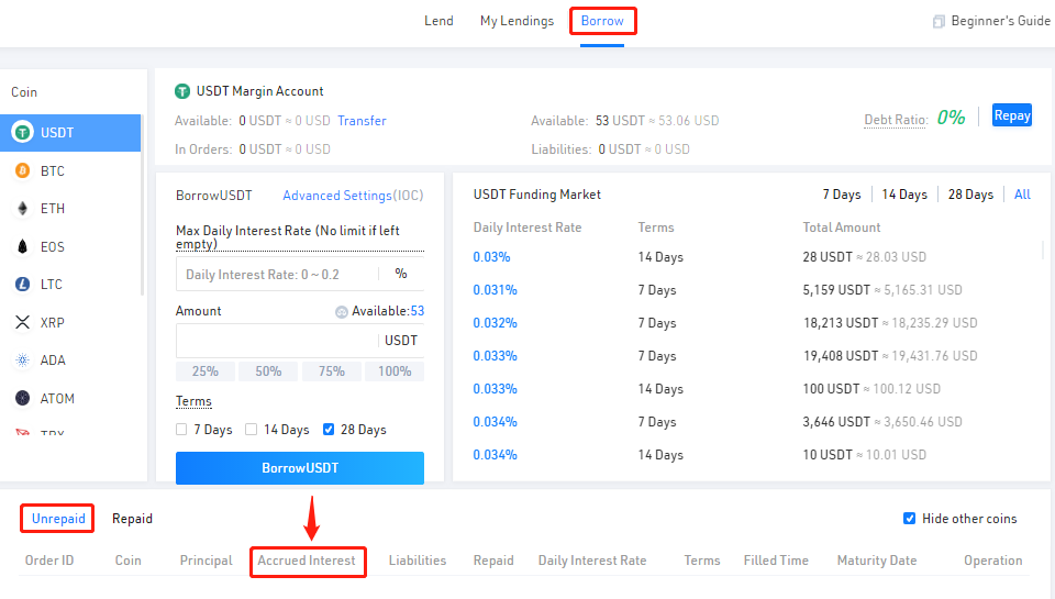 1. Проценты рассчитываются по основной сумме, ежедневной процентной ставке и фактическому времени займа. Вы можете проверить начисленные проценты на странице «Заработать» — «Одолжить» — «Занять», как показано ниже.