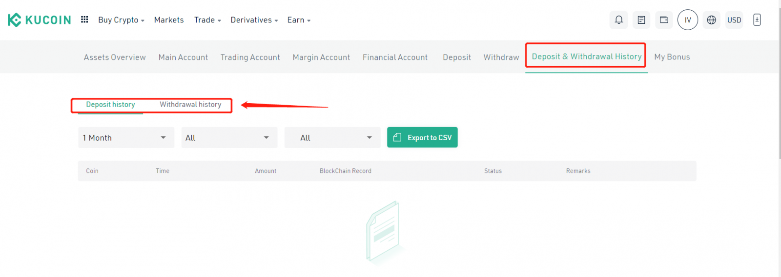 KuCoin предоставляет пользователям услугу по экспорту записей о вводе/выводе средств. Пожалуйста, найдите «Обзор активов» в столбце «Активы» и нажмите «История депозитов и выводов» в правом верхнем углу, вы увидите страницу, как показано ниже: