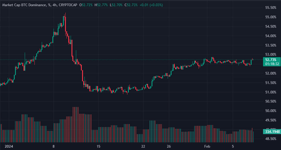 На фоне роста курса биткоина показатель доминирования актива вырос до 52,74%: