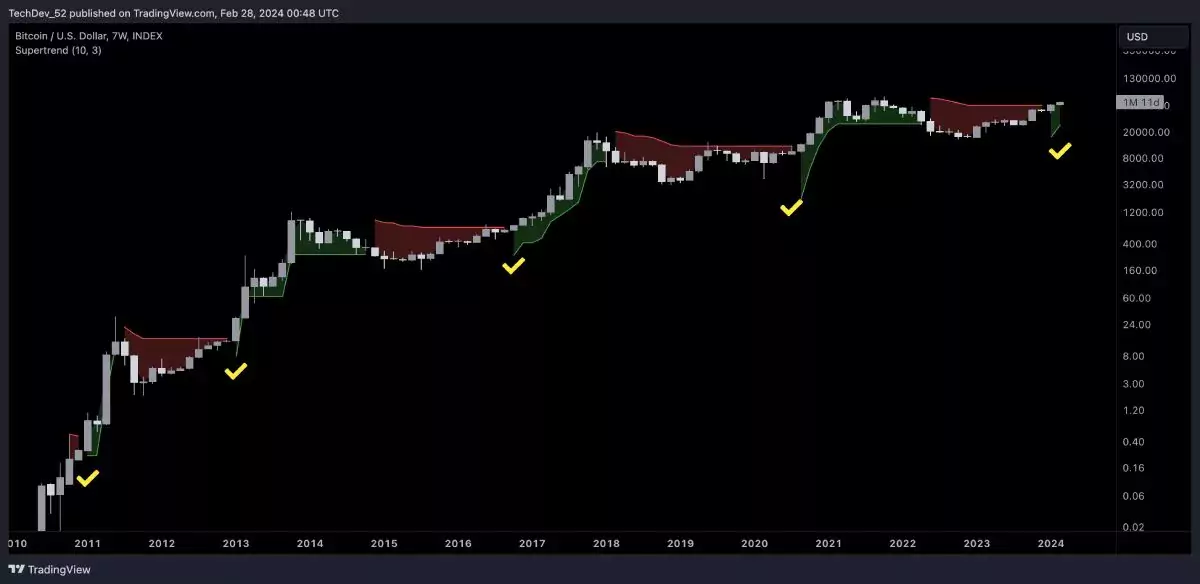 В феврале курс биткоина закрепился над супертрендом, что указывает на продолжение восходящей тенденции.