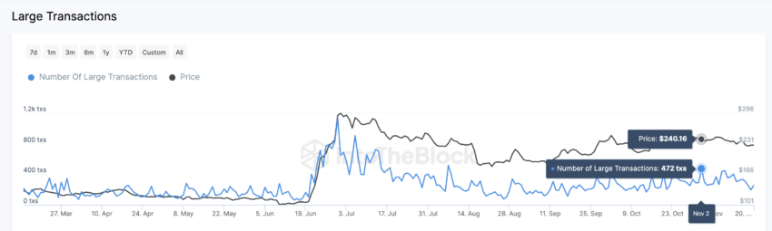 Листинг BCH на EDX markets, криптовалютной торговой площадке, ориентированной на корпоративных инвесторов и поддерживаемой Уолл-стрит, стал одним из основных событий, способствовавших росту цены Bitcoin Cash до пикового значения 2023 года в $329. Однако 1 ноября платформа объявила о делистинге актива, и количество крупных транзакций с BCH начало постепенно снижаться.