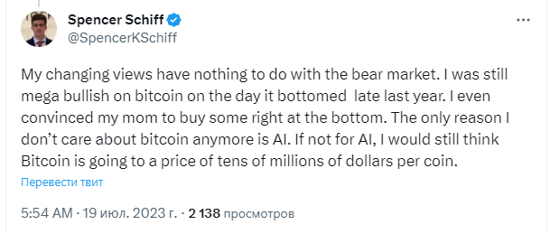 Спенсер Шифф добавил, что, хотя он и считает долгосрочный прогноз цены биткоина его отца верным, это скорее случайное попадание: