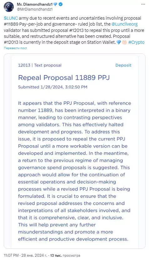 Валидатор экосистемы Terra Luna Classic LuncLive предложил отменить спорное Предложение 11889 с оплатой за работу. Эта инициатива, отражённая в Предложении 12013, направлена на устранение путаницы и неопределённости, которые первоначальное предложение породило среди валидаторов, разработчиков и сообщества в целом.