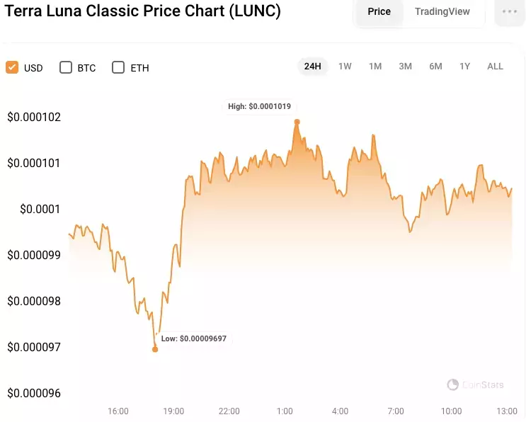 Бычий тренд на рынке Terra Classic (LUNC) преобладал в течение предыдущих 24 часов, при этом поддержка была установлена на внутридневном минимуме в $0,00009815. В результате положительная тенденция подтолкнула LUNC к внутридневному максимуму на $0,0001019, а затем к небольшому падению.