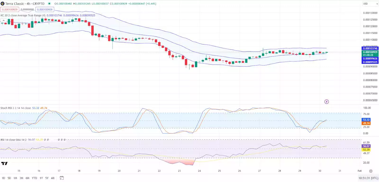 Этот подъём предполагает сильный покупательский спрос, благодаря которому LUNC сможет продолжить положительную тенденцию. Вечером 30 января LUNC торговался на уровне $0,0001006, что на 1,45% выше внутридневного минимума.