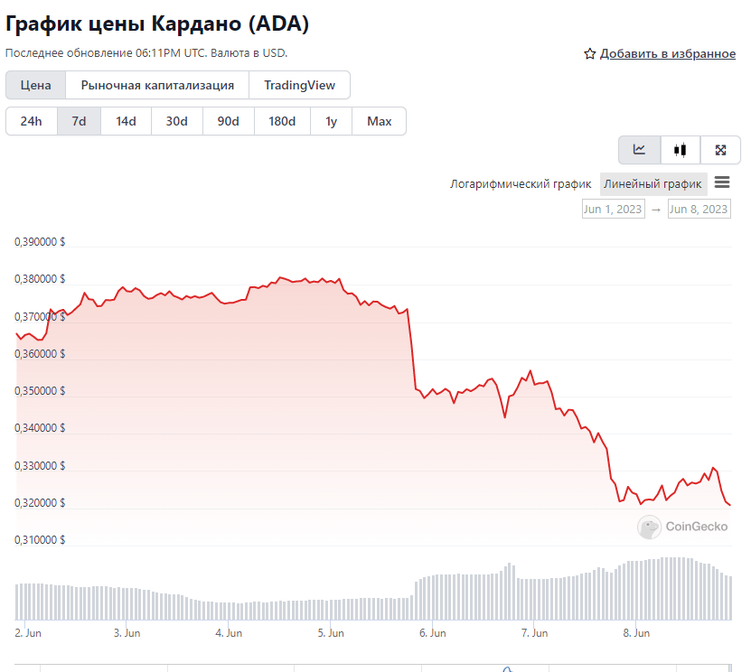 За последнюю неделю стоимость Cardano (ADA) снизилась на 10%, в том числе из-за отнесения альткоина в исках SEC США против Binance и Coinbase к категории ценных бумаг.