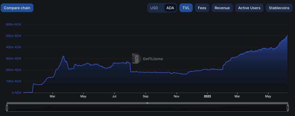 TVL 500 миллионов ADA. Источник: DeFiLllama