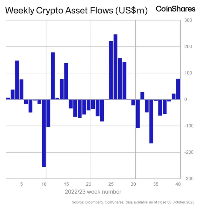 Инвестиционные продукты цифровых активов таких управляющих активами, как CoinShares, Grayscale, 21Shares, Bitwise и ProShares, зафиксировали приток вторую неделю подряд и самый высокий с июля, добавив 78 миллионов долларов США, во главе с фондами Solana и Bitcoin.