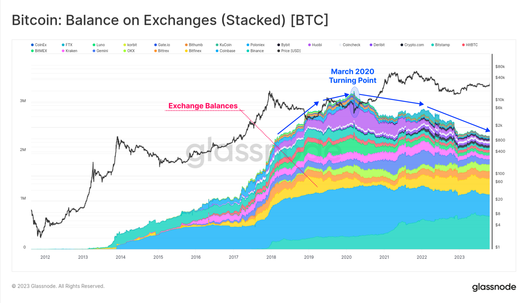 Объем биткоина на балансе биржевых кошельков. Источник: Glassnode