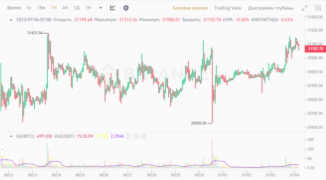 Цена Биткоина вчера на торгах не претерпела значительных изменений, хотя и смогла преодолеть 31 000 долларов. Настроения инвесторов оставались положительными после волны интереса к крипторынку из-за множества заявок на спотовые биржевые фонды Биткоинов (ETF) в последние недели июня, однако уровень около 31 400 долларов для Биткоина все еще остается.