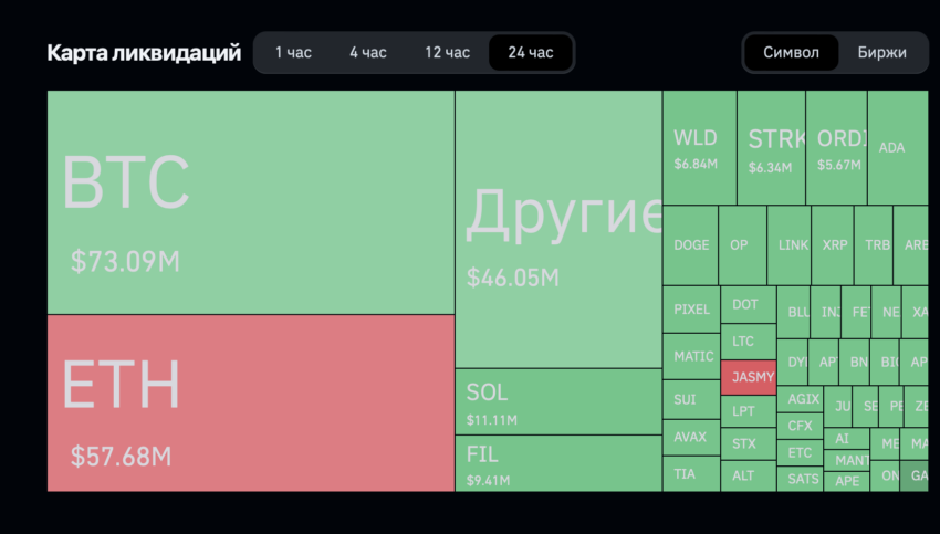 Общая сумма ликвидаций на крипторынке за последние 24 часа превысила 280 млн долларов. Большая часть принудительно закрытых позиций пришлась на BTC и ETH.