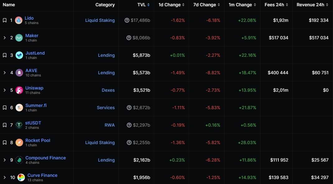 Объем заблокированных средств (TVL) в DeFi-протоколах увеличился до $45,3 млрд. Лидером остался Lido с показателем $17,48 млрд, а вторую и третью строчки рейтинга удержали Maker ($8 млрд) и JustLend ($5,87 млрд) соответственно.