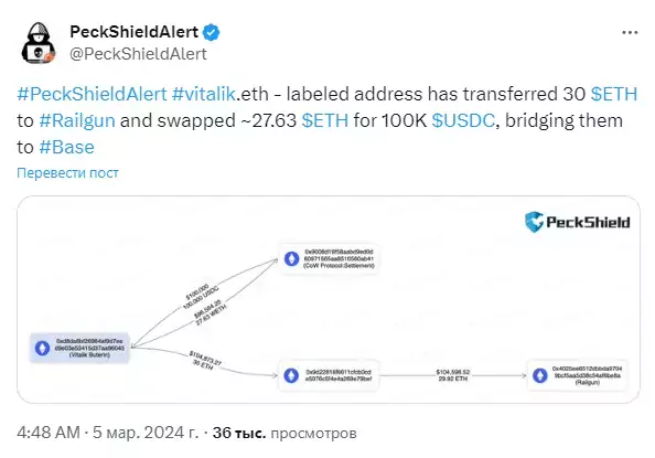 Соучредитель Ethereum Виталик Бутерин снова привлёк к себе внимание криптосообщества после недавнего перевода большого количества Ethereum. По данным компании в сфере безопасности блокчейна PeckShieldAlert, с адреса Vitalik.eth было переведено 30 ETH в пользу проекта Railgun, также владелец кошелька обменял 27,63 ETH на 100 000 USDC.