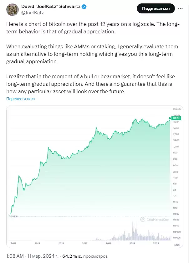 Он подчеркнул, что XRP является активом с высокой волатильностью, похожим на многие криптовалюты, однако он склонен к постепенному повышению курса, что наблюдается у биткоина последние 12 лет.
