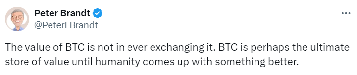 Криптосообщество также поддержал популярный трейдер Питер Брандт, которому удалось верно предсказать криптозиму 2018 года и многие другие движения BTC. По его мнению, биткоин сегодня — лучший инструмент для хранения сбережений, аналогов которого человечество пока что не придумало.