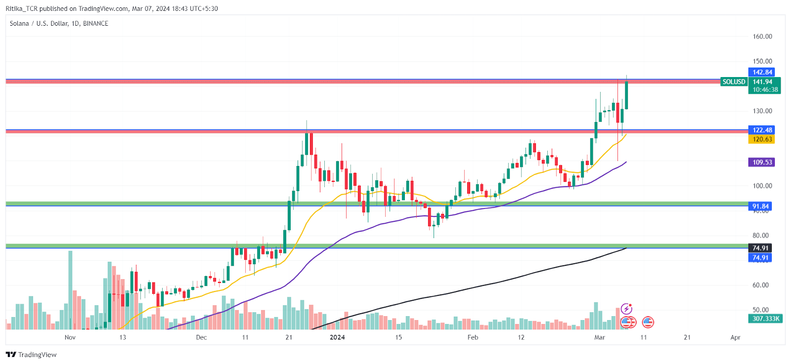 Прогноз биткоина с параболическим ростом поддержал криптоблогер “Coosh” Alemzadeh. При этом обозначенные им цели BTC оказались скромнее тех, что указал Герт ван Лаген. Предполагаемую траекторию движения криптовалюты “Coosh” Alemzadeh обозначил на графике.