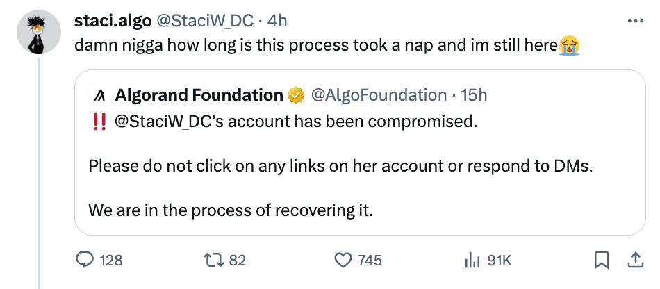 26 января в аккаунте Уорден на X был опубликован пост, в котором сообщество Algorand было названо бедным, но при этом использовалось известное расовое оскорбление (nigga), указывающее на то, что аккаунтом управляет кто-то другой. После этого хакер призвал сообщество продать Algorand (ALGO) и вместо этого купить Ether (ETH).