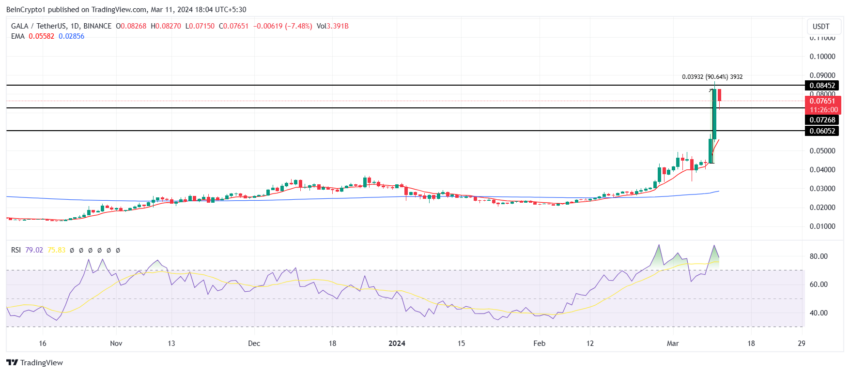 Технический анализ Gala поддерживает вероятность падения цены. Если продажи со стороны китов продолжатся, просадка до $0,06, скорее всего, нивелирует часть недавних достижений.